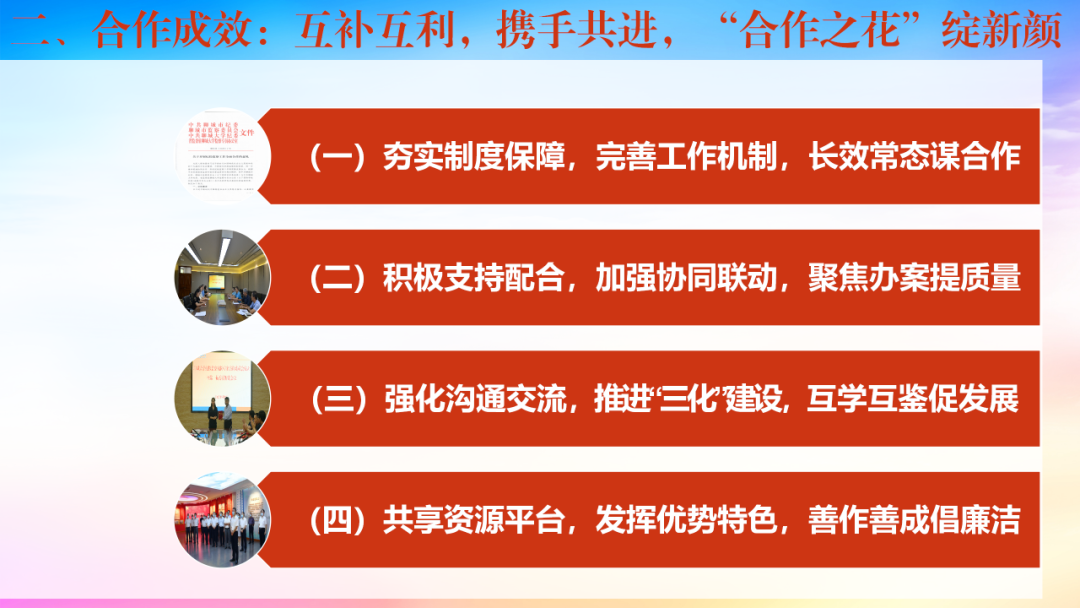 会议充分肯定了“室校地”协作所取得的成效。近年来,在省纪委监委第四监督检查室的指导下,学校纪检监察机构与聊城市纪委监委坚持“共融共进”,不断健全完善联席会议制度和日常工作联络机制;坚持“共联共建”,建立实战实训平台,推动纪检监察业务交流合作常态化;坚持“共研共享”,共同开展廉洁文化建设和廉政理论专项研究,有力促进了纪检监察工作质效提升。