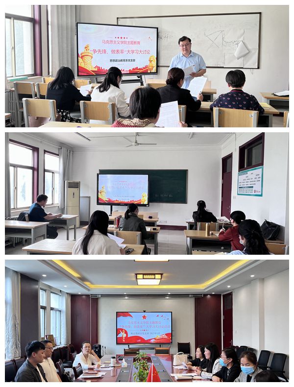 概论教研部党支部、纲要教研部党支部、思政系党支部、基础教研部党支部、原理教研部党支部的党员教师集体学习了《习近平新时代中国特色社会主义思想专题摘编》、习近平关于教育的重要论述、党的二十大报告等内容,围绕思政课教师历史视野的塑造、“历史”何以能够作为思想政治教育的重要平台、思政课教学中“教”与“学”关系的反思、如何发挥党员的先锋模范作用推进思政课教学质量提升等问题进行深入交流和讨论,并结合自身实际,讲认识、谈体会、话感悟、见行动。