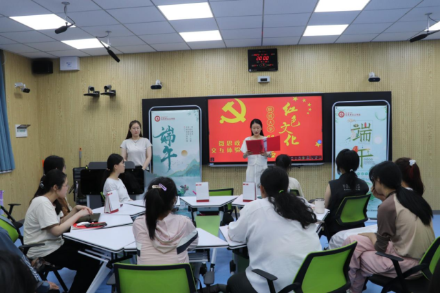 张冰以“端午精神 传承中华”为题,结合一段段生动鲜活的视频和富有价值的历史故事,围绕端午起源、端午习俗、历史渊源、当代价值四个部分,详细讲述了端午节的文化渊源及精神内涵,提醒着当代青年不忘文化根脉,延续精神血脉。她指出,在粽叶飘香、艾草摇曳的时节,端午节不仅是品尝美食、寄托思念的传统佳节,更承载着深厚的文化内涵与时代责任。屈原“路漫漫其修远兮,吾将上下而求索”的执着,“亦余心之所善兮,虽九死其犹未悔”的忠贞,不仅是端午文化的精神内核,更是中华民族精神的生动写照。经千年传承,这一节日早已成为我们铭记历史、传承文明的重要载体。端午习俗中,处处蕴含着智慧与责任。包粽子时,糯米的紧实、粽叶的清香,象征着团结凝聚的力量;赛龙舟时,众人齐划桨、鼓声响彻天,展现出齐心协力、奋勇争先的拼搏精神。这些习俗不仅是文化的传承,更启示着我们在集体生活中,要学会互帮互助、团结协作,为实现共同目标不懈奋斗。她强调,青年学子应主动了解端午背后的历史故事、文化内涵,做中华优秀传统文化的传播者,增强文化认同感与民族自豪感。
