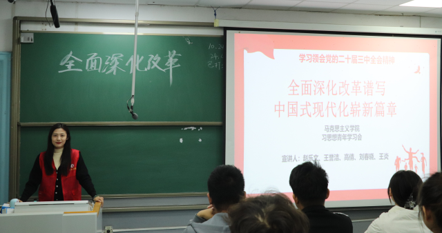 10月24日,色情短视频 青年学习会成员赵乐文、王誉洁、高倩到西校区博喻楼A125开展了题为《全面深化改革谱写中国式现代化崭新篇章》的宣讲。