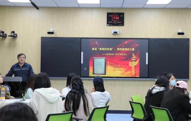 周浩集老师从马克思主义的诞生、改变命运的开始、把握真理的力量、开启伟大复兴征程四个方面,全面系统地讲解了经典著作《共产党宣言》的产生背景和基本内容,并结合实际深入浅出地阐释了《共产党宣言》所彰显的现实意义和时代价值。他谈到,《共产党宣言》不仅是社会主义文献中最具有国际性、影响最大的经典作品,也无疑是世界上传播最广泛的著作之一,它持久地影响着人类社会的进程,而且深深影响中国社会的发展,作为新时代的中国青年,应自觉熟读马克思主义经典著作,读原著、学原文、悟原理,坚定马克思主义信仰,争做新时代青年马克思主义者。