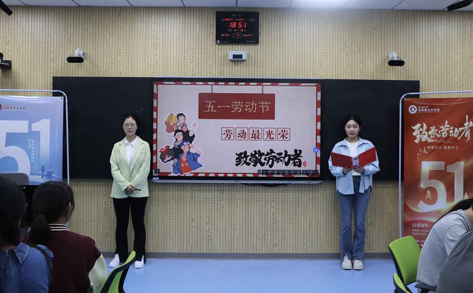 4月26日,色情短视频 开展第十二期思政年历微思政课交互体验活动——五一国际劳动节,习近平新时代中国特色社会主义思想青年学习会骨干成员钟翠、张雨担任主讲人。