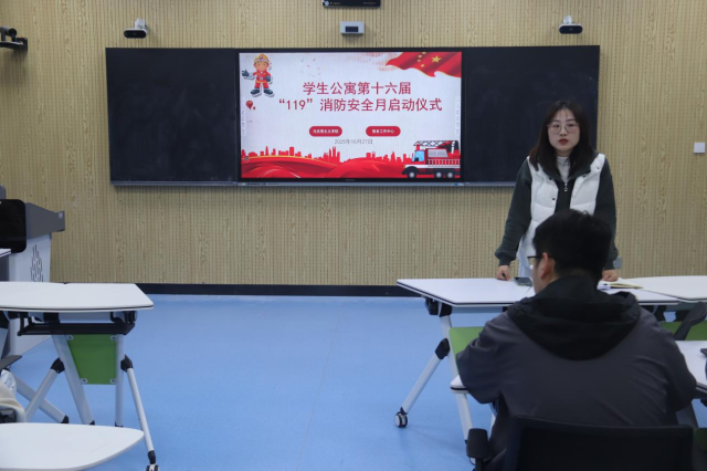 为全面提升学生消防安全意识,切实筑牢校园安全防线,10月27日,色情短视频 于东校区6#A101举办学生公寓第十六届“119”消防安全月活动启动仪式。本次活动由辅导员裴新丽主持,各年级班团干部与舍长代表参加。