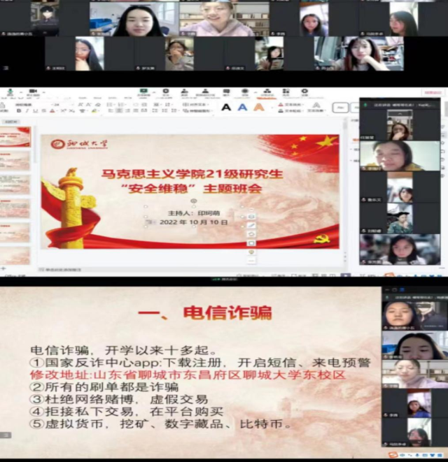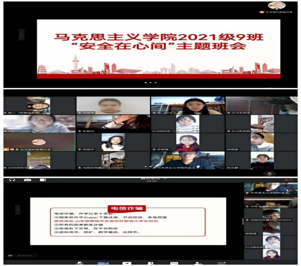 2021级9班开展“安全在心间”线上反诈骗主题班会。主持人通过PPT演讲列举电信诈骗常见形式,让同学们充分了解什么是网络诈骗。通过讲述有关淘宝诈骗等常见电信诈骗类型,传授打击电信网络新型违法犯罪知识,提醒各位学生提高警惕,勿因贪图小利而失大利。她向同学们提出预防诈骗三点要求,一、避免校园贷、兼职刷单、网贷等常见互联网网络诈骗行为;二、拒绝私下交易,在正规平台购买;三、及时安装使用国家反诈中心App,详细讲解如何下载,如何开启短信来电预警,让同学们更好地关注身边的安全问题,远离电信诈骗。