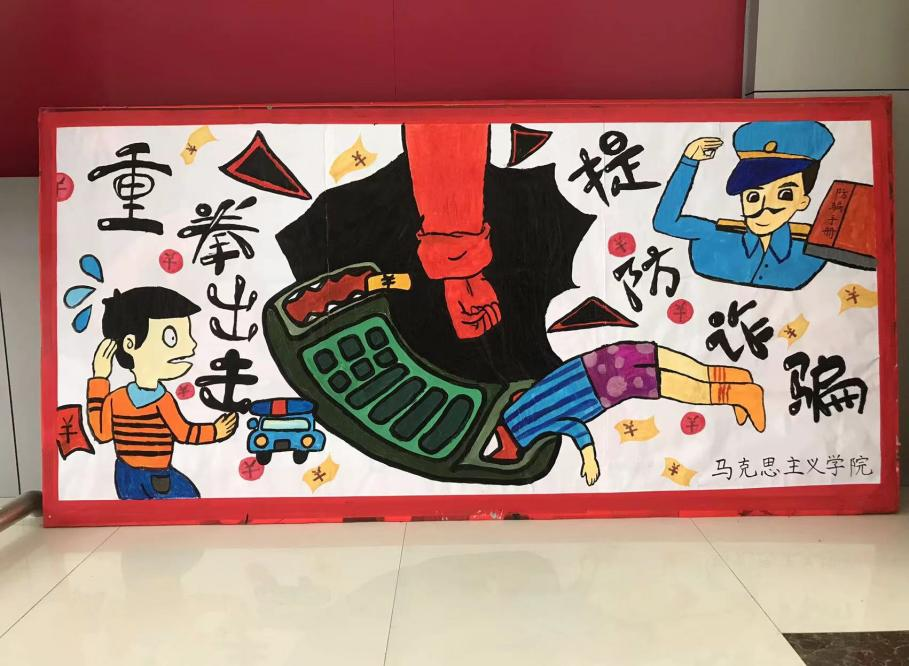 学院将宣传单张贴在宣教栏,邀请同学们一起创作“重拳出击,提防诈骗”为主题的板报展板,将其放置在学院内供同学们浏览,从而更好地加强他们自身防范意识。学院通过浅显易懂的形式宣传相关的反诈骗知识,使同学们能够谨防诈骗,树立防诈骗的意识,开展多层次、全方位、无死角的防诈宣传,从思想上提高广大师生的反诈意识及能力,构建“无处不在”的校园反诈保护网。
