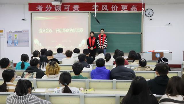 宣讲团成员坚持论从史出,立足马克思主义理论基础,结合丰富史料与视频素材从遵义会议的背景,遵义会议的召开过程以及遵义会议的意义三个方面与同学们一同回顾了那段艰苦卓绝的革命岁月,感悟以毛泽东同志为代表的中国共产党人在革命危难时刻的坚定信念。宣讲团成员谈到,遵义会议是在紧急的战争形势下召开的,没有全面地讨论政治路线方面的问题,而是集中地解决了党内所面临的最迫切的组织问题和军事问题,确立了毛泽东在红军和中共中央的领导地位,是中国共产党第一次独立自主地运用马克思列宁主义基本原理解决自己的路线、方针和政策的会议。它在极端危险的时刻,挽救了党和红军,是中国共产党历史上一个生死攸关的转折点,标志着中国共产党从幼年达到成熟。红色遵义经典磅礴,它所传承的“实事求是、独立自主、民主团结、坚定信念、敢闯新路”的遵义会议精神始终是激励共产党人迈步向前的强大精神动力。