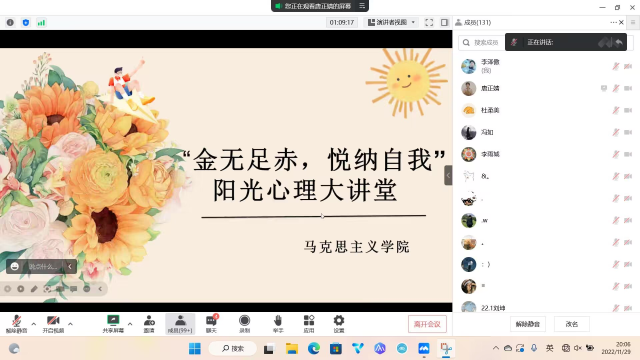 为丰富学生的课余生活,提高同学们的自我接纳与心理抗压能力,12月2日,色情短视频 于线上举办“金无足赤,悦纳自我”阳光心理大讲堂活动,教育科学学院研究生曹欣欣担任主讲人。