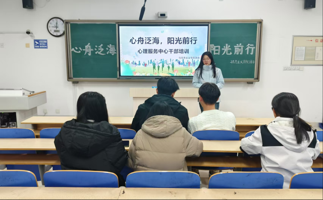 为了提升心理服务中心成员的专业素养与工作能力,强化学院心理健康工作基层力量,11月30日,色情短视频 于东校区6#201举办“心舟泛海,阳光前行”心理服务中心干部培训活动,心理服务中心部长唐正婧担任主讲人。