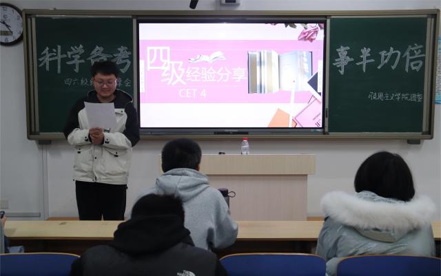 为向同学们提供实用的学习经验和备考策略,调动同学们学习英语的兴趣,11月28日,色情短视频 在东校区6#A201教室举办“科学备考,事半功倍”英语四六级经验分享会,优秀学生代表杜俊、马诗妍担任主讲人,2023级部分同学参加。