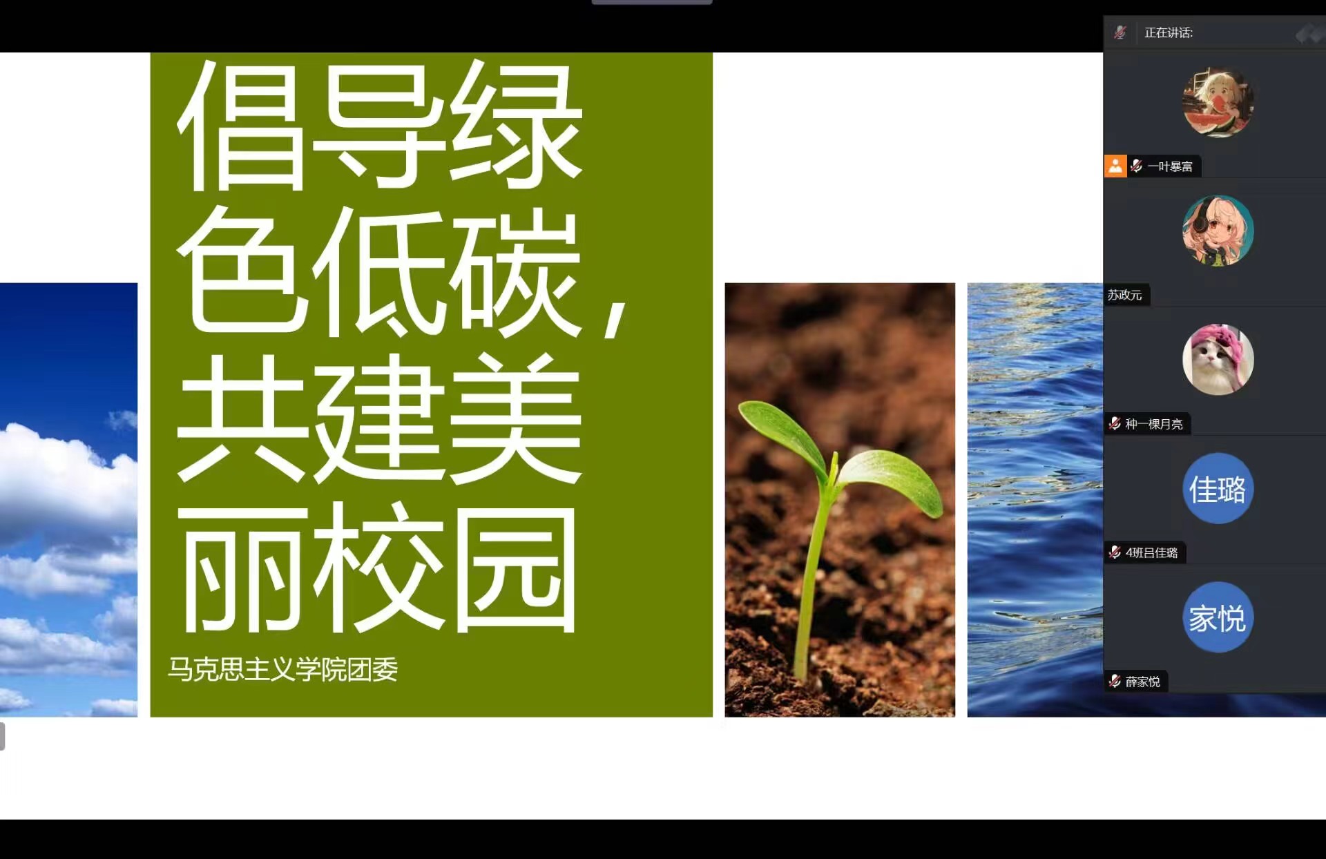节约低碳新风尚,绿色环保我先行。活动围绕“节约资源”“保护环境”“绿色低碳”“生态文明”等话题进行科普,同学们认真学习,在深刻领会到保护环境的重要性后,通过发放调查问卷,就当代大学生的环保知识水平、环保意识、校园内的环境污染现象展开调查。报告结果显示,大部分参与调研的人员对绿色环保概念有一定程度了解。但绿化带破坏、白色污染、水资源浪费等问题仍存在于校园中,青年学生的环保意识仍需提高,校园环保工作面临诸多挑战。交流环节中,同学们积极表达自己的观点,在绿化保护、节约资源、垃圾分类、宣传教育等方面提出许多创新性建议,为建设美丽校园贡献一份力量。