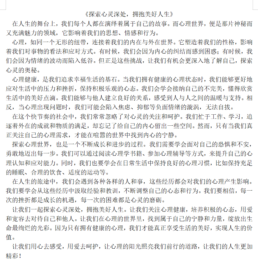 此次大赛“心舞飞扬,慧心启航”为主题,以分享自己的心灵故事、关注心理健康问题为重点,要求学生自主创作,鼓励同学们通过文字表达自我,深入探索心理世界。同学们积极响应,纷纷投稿,用自己的笔触描绘出对心理健康的独到见解和真实感受,作品主题广泛,内容深刻,关注大学生常见的心理困扰并探讨压力管理与情绪调节,此外,还分享个人在心理成长过程中的经历与感悟,每一篇作品都展现了对心理健康问题的深度思考和真挚情感。其中,唐崭翼的《探索心灵深处,拥抱美好人生》文笔斐然,感情真挚,她呼吁大家,关注心理健康,培养积极的心态,用爱和宽容去对待自己和他人,找到属于自己的宁静和力量。经过严格评选,张慧卿获一等奖,栾佳恬、唐崭翼获二等奖,马瑞雪、刘馨、李晓倩获三等奖。