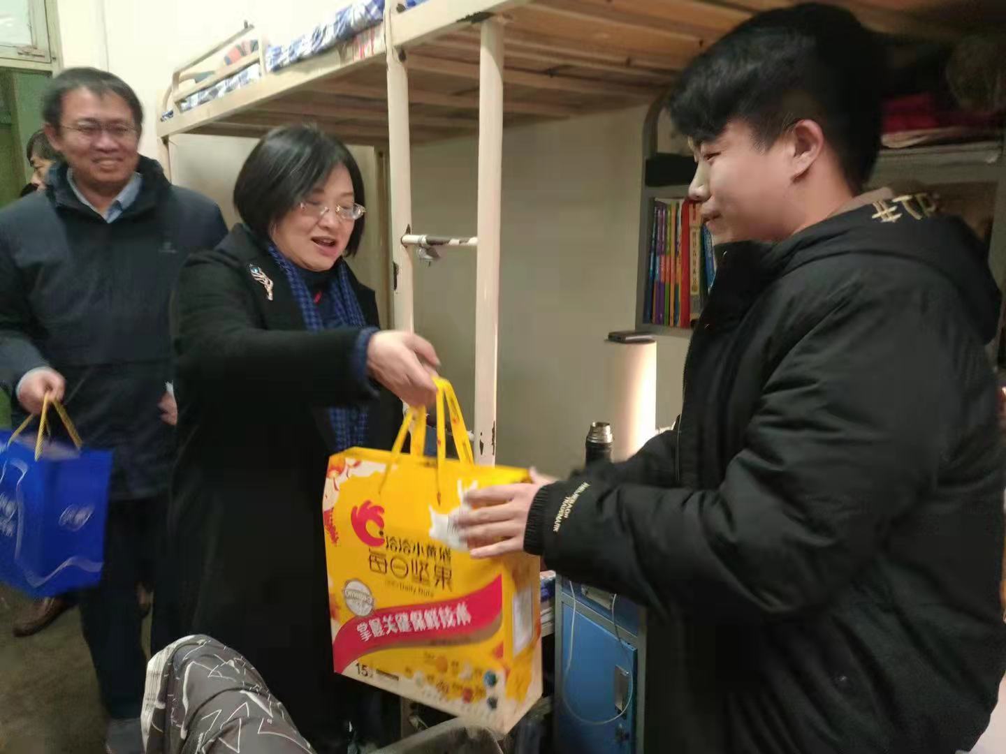 老师们首先向家庭困难的同学们表达了关心,仔细询同学们学习和生活上遇到的各种困难,并有针对性地提出解决方法。张华筠就疫情防控要求、交通安全、消防安全以及饮食安全等各项安全问题对同学们进行了强调。同时,张华筠提出在疫情防控的紧急关头,同学们返乡途中一定要做好个人防护,全程佩戴口罩。亲切叮咛的话语让同学们感受到家一般的温暖。随后,领导和老师们为在校学生送去了学院准备的慰问品,表达了学校对家庭经济困难学生的关心关怀。同学们接过慰问品,向老师们表达了深深的谢意,表示在归家的兴奋之余,对学校给予的关心十分感动,有了学校的关怀,归家之旅更加幸福,新年也变得更快乐,更加有意义。