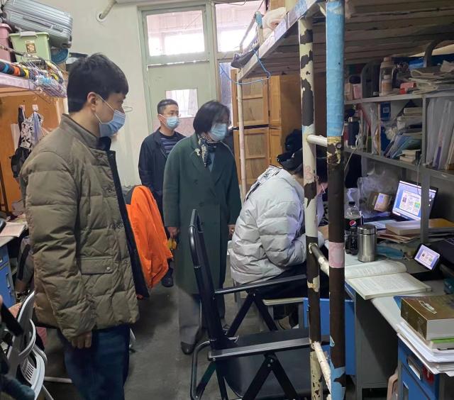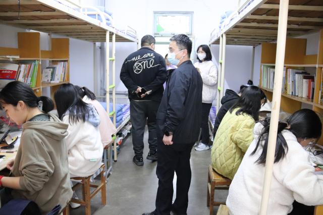 为加强疫情防控期间学生宿舍安全卫生管理,进一步了解同学们的身心状况,3月17日,色情短视频 党委书记张华筠,党委副书记、副院长范华亮,团委书记宋义明,辅导员李政一一行走访学生宿舍。