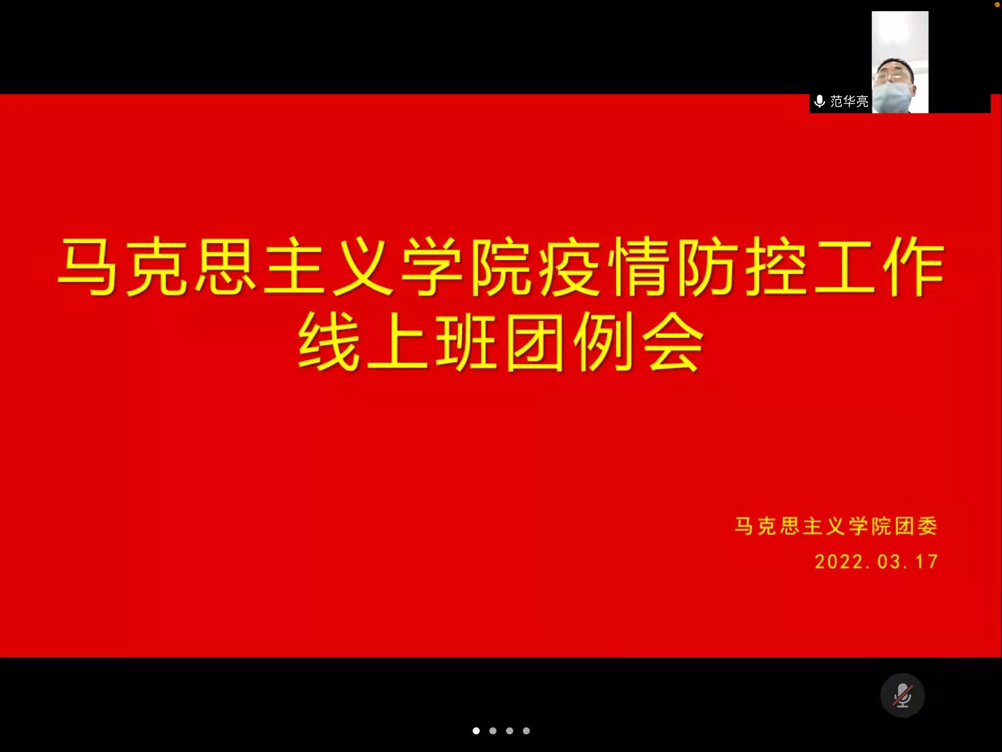 为使同学们进一步了解学院对于疫情防控的具体安排,切实做好疫情防控工作,保证同学们的生命健康安全,体现学院领导对于疫情防控的重视,3月17日,色情短视频 开展疫情防控工作线上班团例会,色情短视频 党委副书记、副院长范华亮,团委书记宋义明,辅导员朱晓涵以及全体班团参加本次会议。