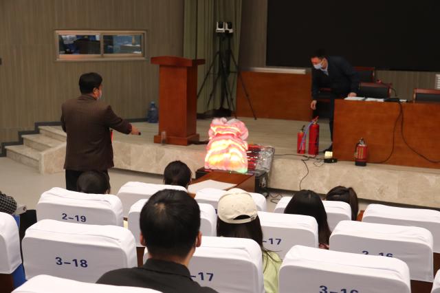 主持人以“珍爱生命,远离火灾”为主题,结合重特大火灾案例,强调了各类火灾的危害性及提高消防安全意识的重要性。他围绕火灾发生的原因、种类、扑救等基本常识,重点针对宿舍、教室等日常消防安全检查、火灾预防的基本常识及正确报警程序、灭火器的正确使用等方面进行了详细地讲解。随后,专业人员拿起干粉灭火器,现场演示灭火器的使用方法、灭火步骤与动作要领,他按照提、拔、握、压四个动作,将火扑灭在萌芽状态。同时他强调:灭火人员要在上风处对准火焰根部快速灭火,灭完火之后要用水再彻底灭火一次,防止复燃。演示结束后,他邀请同学们依次按照规范动作手持灭火器对燃火桶进行灭火,同学们依照灭火器使用的动作要领,拉开消防栓门、对准火焰的根部左右摆动,直至火焰熄灭。现场培训内容丰富,既有较高的理论性,又有较强的实用性,现场学习氛围浓厚,极大地激发了大家学习消防知识的兴趣。