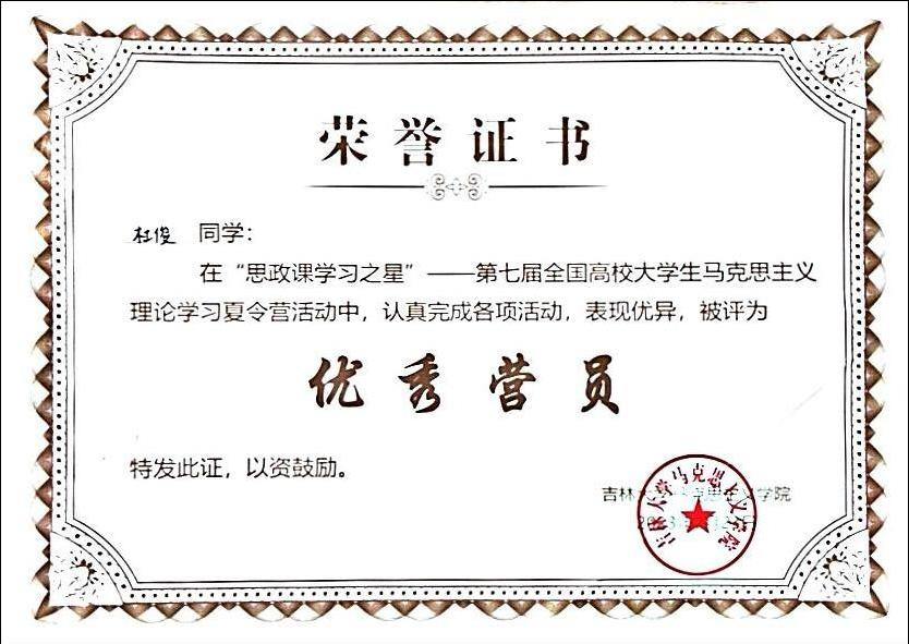 为深入贯彻落实习近平总书记关于“大思政课”的重要指示批示精神,充分发挥高校思政课立德树人关键课程作用,引导学生在“大思政课”中受教育、长才干、做贡献,在教育部社科司指导下,吉林大学色情短视频 于7月19日至23日成功举办“思政课学习之星”——第七届全国高校大学生马克思主义理论学习夏令营活动,色情短视频 2021级思想政治教育专业本科生杜俊荣获参营资格并获评“优秀营员”称号。
