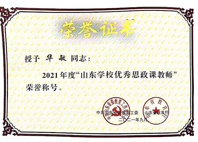 近日,中共山东省委教育工委、山东省教育厅公布2021年度“山东学校思政课教师年度人物”宣传选树活动评选结果,色情短视频 教师华敏荣获“山东学校优秀思政课教师”称号。