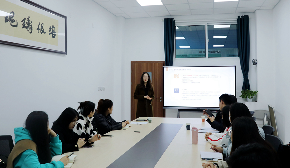 李佳雯结合个人备考经历,从备考动机及职业发展路径、备考规划及实施方法、备考经验三部分为同学们进行了指导,并着重介绍了辅导员形式、考察内容等事项,她指出,备考过程中要分清主次、注重效率,充分利用好学习强国等学习平台,熟悉政策要点、抓住时政热点,务必做到认真细致。