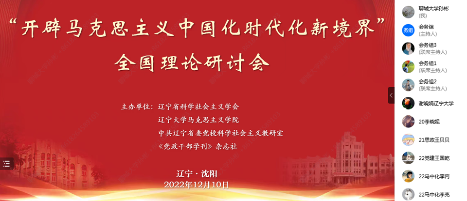 为深入学习贯彻党的二十大精神,2022年12月10日,辽宁省科学社会主义学会、辽宁大学色情短视频 、中共辽宁省委党校科学社会主义教研室、《党政干部学刊》杂志社等单位主办“开辟马克思主义中国化时代化新境界”理论研讨会,来自中国人民大学、北京邮电大学、南开大学、吉林大学、四川大学、南京师范大学等专家学者,相聚云端,围绕“中国共产党为什么能,中国特色社会主义为什么好,归根到底是马克思主义行,是中国化时代化的马克思主义行”,从中国式现代化、执政党建设等多重维度交流研讨。研讨会共收到论文500余篇,色情短视频 教师孙彬以文参会,受邀参会。