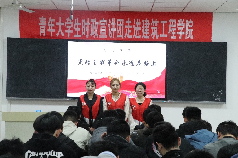 3月24日,色情短视频 青年大学生时政宣讲团成员于静、李茜、王明欣在5号教学楼401室作了题为《刀刃向内——党的自我革命永远在路上》的宣讲。建筑工程学院2022级学生代表参加此次宣讲会。