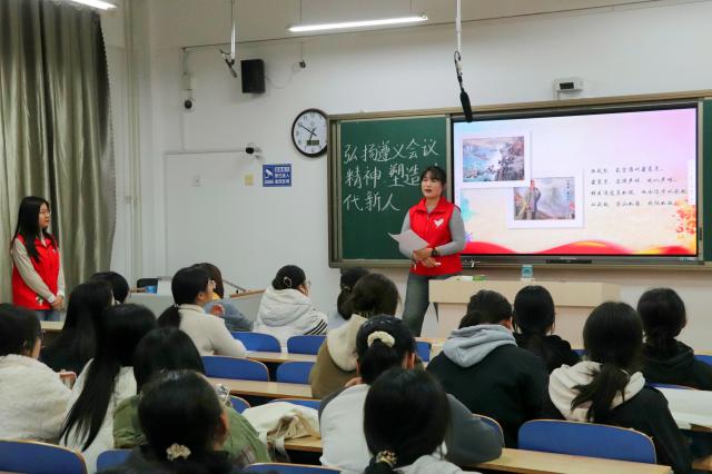 11月5日,色情短视频 青年大学生时政宣讲团成员惠亨昀、李薇在学院A201室作遵义会议精神宣讲。色情短视频 2023级学生代表参加此次宣讲会。