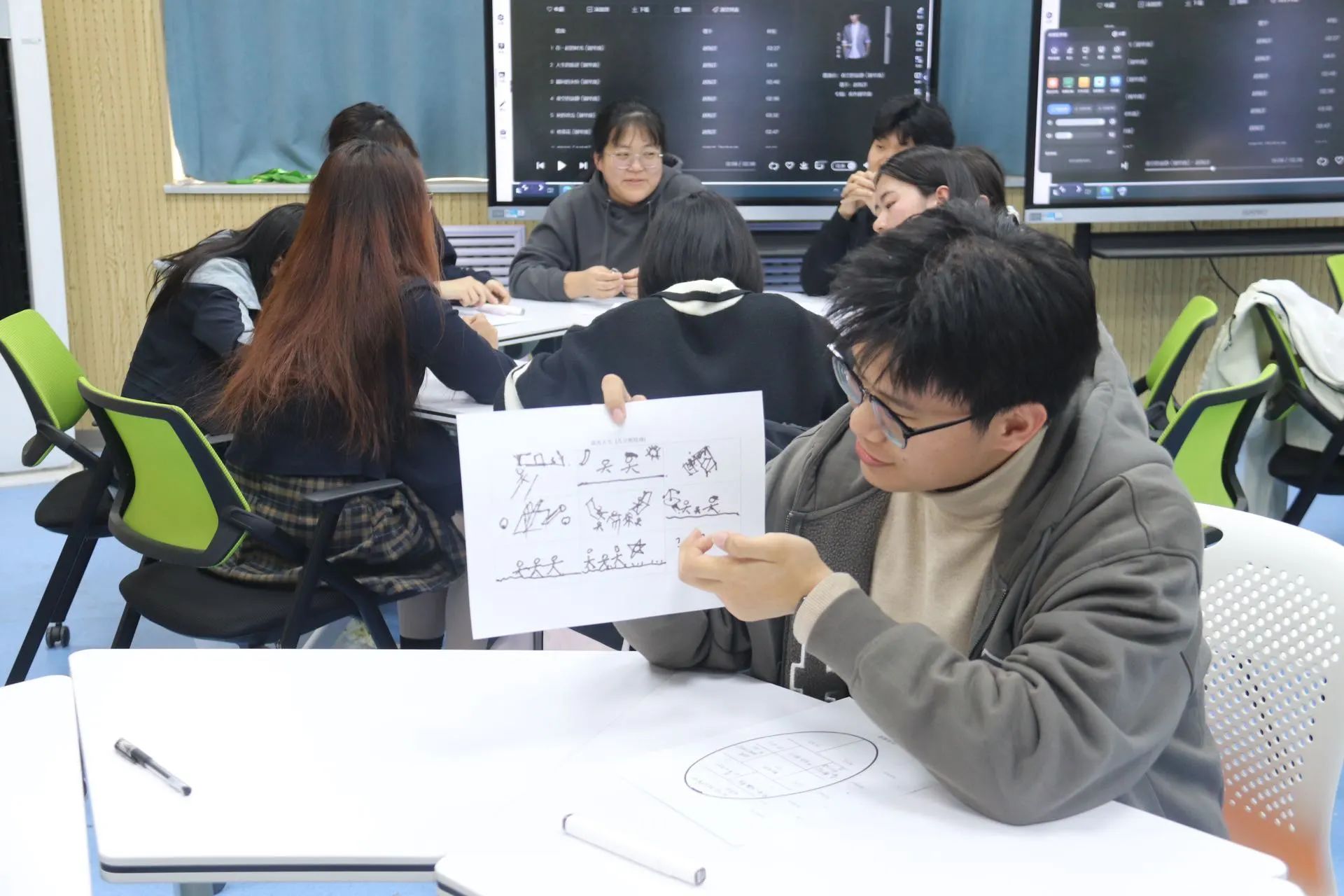活动围绕人际互动、自我认知和团队交流三个环节展开,为同学们提供了多维度、全方位的指导,帮助他们逐步挖掘自身优势与兴趣所在,打破对职业认知的模糊壁垒。在人际互动环节,在场同学分为四组,以"姓名+成长关键点"的形式向组内成员陈述个人经历,每组最后一位成员完整复述出所有组员信息,同学们在开诚布公、畅所欲言的交流讨论中增进了彼此间的相互了解。