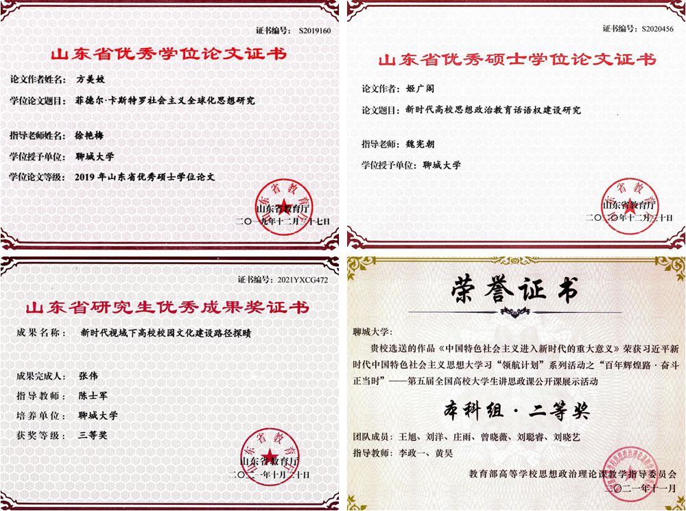 近年来,学院先后获批教育部专项教研课题5项,省级教学改革项目7项,校级教学改革项目11项;获山东省优秀教学成果二等奖3项,教育部多媒体课件大赛一等奖3项。获全国高校思想政治理论课教学展示活动一等奖1项、三等奖1项,获全国高校大学生讲思政课公开课展示活动二等奖1项,三等奖2项,获山东高校思想政治理论课教学比赛一二三等奖12项,在全国大学生各项竞赛中累积获得奖项三百余项。历年来,色情短视频 研究生获校级、省级研究生优秀硕士论文,研究生优秀成果奖,研究生教育质量提升计划项目等各级各类奖项数量众多。