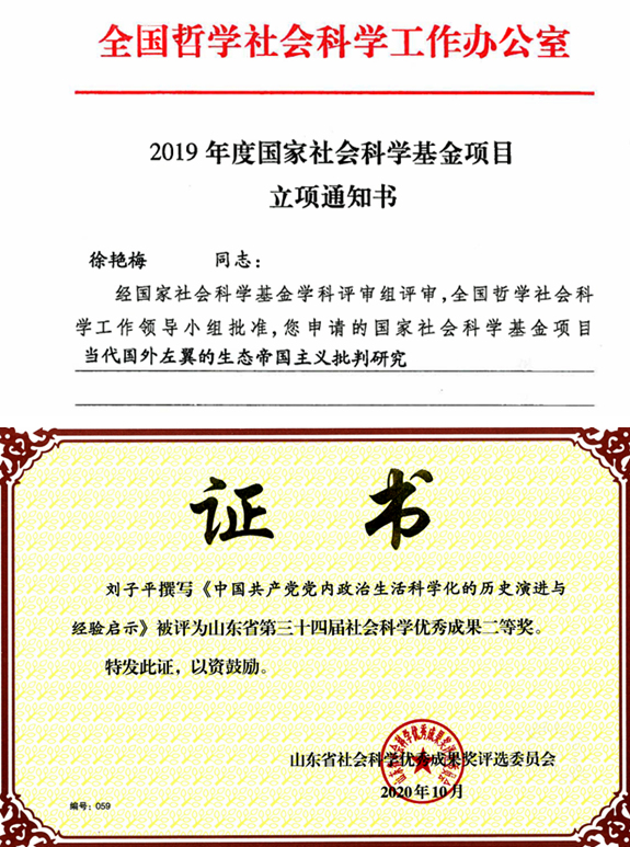 学院牢固树立“科研兴院”理念,坚持以科研为先导,强化学科和学位点建设,着力打造高水平学术团队,坚定不移地推动学科建设上层次。现有山东高校舆情研究基地、山东省中外社会主义比较研究基地等3个省级重点研究基地和冀鲁豫边区革命史研究中心、马克思主义理论教育创新发展研究中心、孔繁森精神和西部援建研究中心等3个市级重点研究基地。近年来,获批国家社科基金重点项目、国家社科基金一般项目、教育部人文社科规划项目、山东省社科规划项目等国家级、省部级课题40余项,获得山东省社科优秀成果奖、山东高校优秀科研成果奖30余项。在高等教育评价专业机构软科发布的“软科中国最好学科排名”中,我校马克思主义理论学科年年上榜,多年来在全国所有设有马克思主义理论研究生学位授权点的高校中均名列前50%。